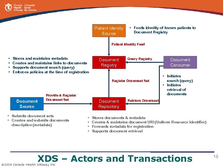 DI Projects Across Canada • Most provinces in Canada § Have deployed digital DI modalities and PACS/RIS solutions § Have completed architecture for DI Repository (or multiple Repositories) integrated with the EHR § Plan to deploy interoperable EHR / DI solutions All DI Solutions § Span multiple health regions, hundreds of hospitals, and DI clinics § Integrate multi-vendor PACS / RIS environment § Are designed to handle • Multiple patient identification domains and EMPI services • Multiple security domains • Millions of exams per year (e. g. , Alberta: over 4. 5 million) § Provide services to thousands of users (e. g. Alberta: over 15, 000) 2008 Canada Health Infoway Inc. 9