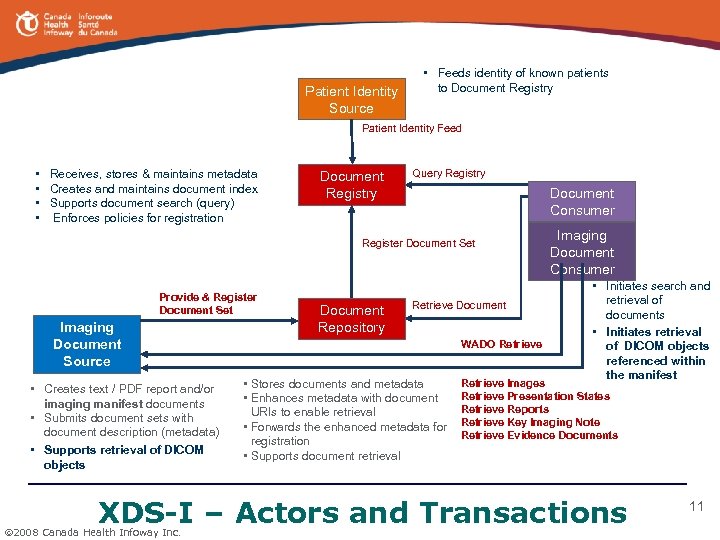 Patient Identity Source • Feeds identity of known patients to Document Registry Patient Identity Feed • • Stores and maintains metadata Creates and maintains links to documents Supports document search (query) Enforces policies at the time of registration Document Registry Query Register Document Set Document Source Provide & Register Document Set • Submits document sets • Creates and submits documents description (metadata) Document Repository • • Document Consumer • Initiates search (query) • Initiates retrieval of documents Retrieve Document Stores documents & metadata Creates & maintains document URI (Uniform Resource Identifier) Forwards metadata for registration Supports document retrieval XDS – Actors and Transactions 2008 Canada Health Infoway Inc. 10