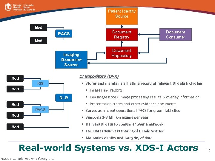 Patient Identity Source • Feeds identity of known patients to Document Registry Patient Identity Feed • Receives, stores & maintains metadata • Creates and maintains document index • Supports document search (query) • Enforces policies for registration Document Registry Query Registry Document Consumer Register Document Set Provide & Register Document Set Imaging Document Source • Creates text / PDF report and/or imaging manifest documents • Submits document sets with document description (metadata) • Supports retrieval of DICOM objects Document Repository Retrieve Document WADO Retrieve • Stores documents and metadata • Enhances metadata with document URIs to enable retrieval • Forwards the enhanced metadata for registration • Supports document retrieval Imaging Document Consumer • Initiates search and retrieval of documents • Initiates retrieval of DICOM objects referenced within the manifest Retrieve Images Retrieve Presentation States Retrieve Reports Retrieve Key Imaging Note Retrieve Evidence Documents XDS-I – Actors and Transactions 2008 Canada Health Infoway Inc. 11