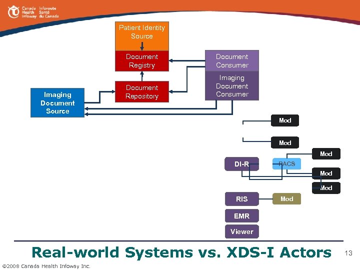 Patient Identity Source Mod Document Registry PACS Mod Imaging Document Source Document Consumer Document Repository DI Repository (DI-R) Mod • Stores and maintains a lifetime record of relevant DI data including RIS Mod • Images and reports DI-R • Key image notes, image processing results & overlay information • Presentation states and other evidence documents Mod PACS Mod • Serves as shared operational PACS for greenfield sites • Supports 2 -3 Million exams per year • Delivers DI data to consumer over a network • Facilitates seamless sharing of DI information • Maintains quality and integrity of data Real-world Systems vs. XDS-I Actors 2008 Canada Health Infoway Inc. 12