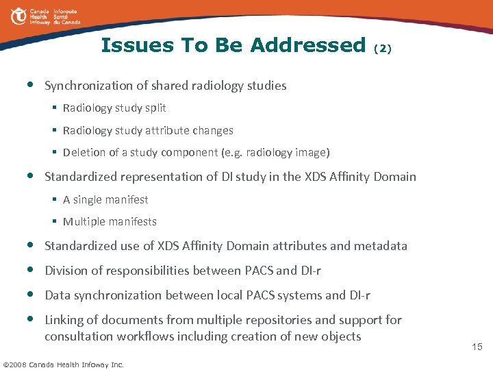 Issues To Be Addressed • (1) How to ensure interoperability of XDS-based systems with other solutions that handle discrete data (e. g. , Lab, Drug)? § How does an XDS Registry for DI evolve into and/or co-exist with other indexing scheme? § How to ensure other XDS/XDS-I consumers (e. g. , EMR) adopt Document Consumer actor capabilities to access DI content? • How to provide document sharing capabilities across multiple affinity domains? • How to ensure data quality attributes (e. g. , accuracy, completeness, integrity) are maintained/preserved in a data sharing environment? • How to provide a uniform clinical terminology given a multitude of terminology schemes and vocabularies? • How does a jurisdiction approach XDS Affinity Domain policies for consumers that are “associated “with the Affinity Domain (GP, Specialist) but not “in” the Affinity Domain? 2008 Canada Health Infoway Inc. 14 14