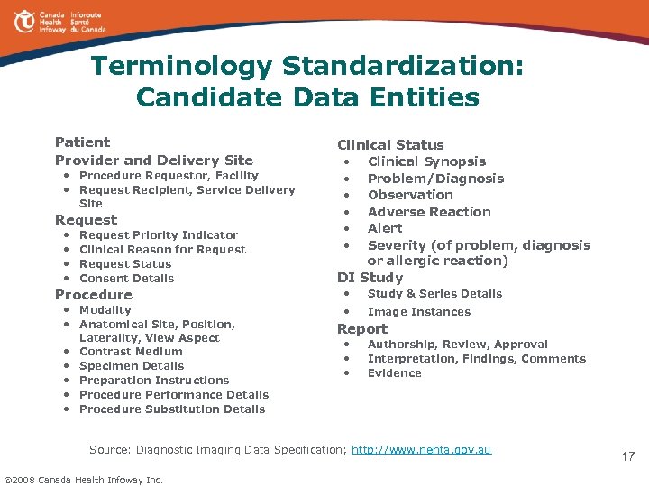 Terminology Standardization: Candidate Data Entities Patient Provider and Delivery Site • Procedure Requestor, Facility • Request Recipient, Service Delivery Site Request • • Request Priority Indicator Clinical Reason for Request Status Consent Details Procedure • Modality • Anatomical Site, Position, Laterality, View Aspect • Contrast Medium • Specimen Details • Preparation Instructions • Procedure Performance Details • Procedure Substitution Details Clinical Status • Clinical Synopsis • Problem/Diagnosis • Observation • Adverse Reaction • Alert • Severity (of problem, diagnosis or allergic reaction) DI Study • Study & Series Details • Image Instances Report • • • Authorship, Review, Approval Interpretation, Findings, Comments Evidence Source: Diagnostic Imaging Data Specification; http: //www. nehta. gov. au 2008 Canada Health Infoway Inc. 17