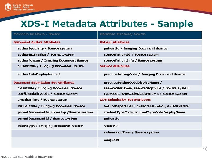 XDS-I Metadata Attributes - Sample Metadata Attribute / Source Metadata Attribute/ Source Document Author Attributes Patient Attributes author. Specialty / Source system patient. Id / Imaging Document Source author. Institution / Source system source. Patient. Id / Source system author. Person / Imaging Document Source source. Patient. Info / Source system author. Role / Imaging Document Source author. Role. Display. Name / Document Submission Set Attributes Service Attributes practice. Setting. Code / Imaging Document Source practice. Setting. Code. Display. Name / class. Code / Imaging Document Source service. Start. Fime, service. Stop. Time / Source system confidentiality. Code / Source system type. Code, type. Code. Display. Name / Source system creation. Time / Source system XDS Submission Set Attributes format. Code / Imaging Document Source author. Department, author. Institution, author. Person parent. Document. Relationship /Source system content. Type. Code, content. Type. Code. Display. Name parent. Document. Id / Source system patient. Id mime. Type / Imaging Document Source source. Id submission. Time / Source system unique. Id 18 2008 Canada Health Infoway Inc.