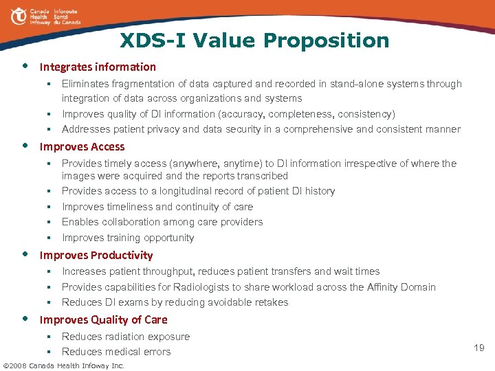 XDS-I Value Proposition • Integrates information § Eliminates fragmentation of data captured and recorded in stand-alone systems through integration of data across organizations and systems § Improves quality of DI information (accuracy, completeness, consistency) § Addresses patient privacy and data security in a comprehensive and consistent manner • Improves Access § Provides timely access (anywhere, anytime) to DI information irrespective of where the images were acquired and the reports transcribed § Provides access to a longitudinal record of patient DI history § Improves timeliness and continuity of care § Enables collaboration among care providers § Improves training opportunity • Improves Productivity § Increases patient throughput, reduces patient transfers and wait times § Provides capabilities for Radiologists to share workload across the Affinity Domain § Reduces DI exams by reducing avoidable retakes • Improves Quality of Care § Reduces radiation exposure § Reduces medical errors 2008 Canada Health Infoway Inc. 19