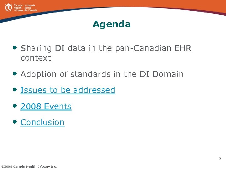 Agenda • Sharing DI data in the pan-Canadian EHR context • Adoption of standards in the DI Domain • Issues to be addressed • 2008 Events • Conclusion 2 2008 Canada Health Infoway Inc.