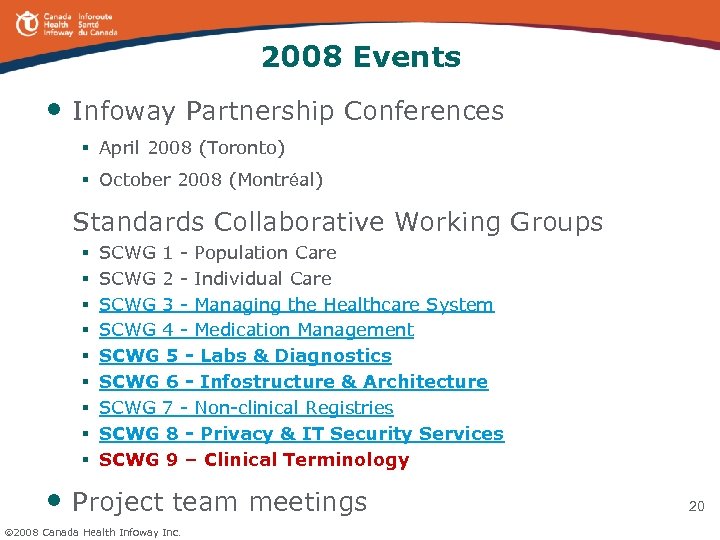 2008 Events • Infoway Partnership Conferences § April 2008 (Toronto) § October 2008 (Montréal) Standards Collaborative Working Groups § § § § § SCWG 1 - Population Care SCWG 2 - Individual Care SCWG 3 - Managing the Healthcare System SCWG 4 - Medication Management SCWG 5 - Labs & Diagnostics SCWG 6 - Infostructure & Architecture SCWG 7 - Non-clinical Registries SCWG 8 - Privacy & IT Security Services SCWG 9 – Clinical Terminology • Project team meetings 2008 Canada Health Infoway Inc. 20
