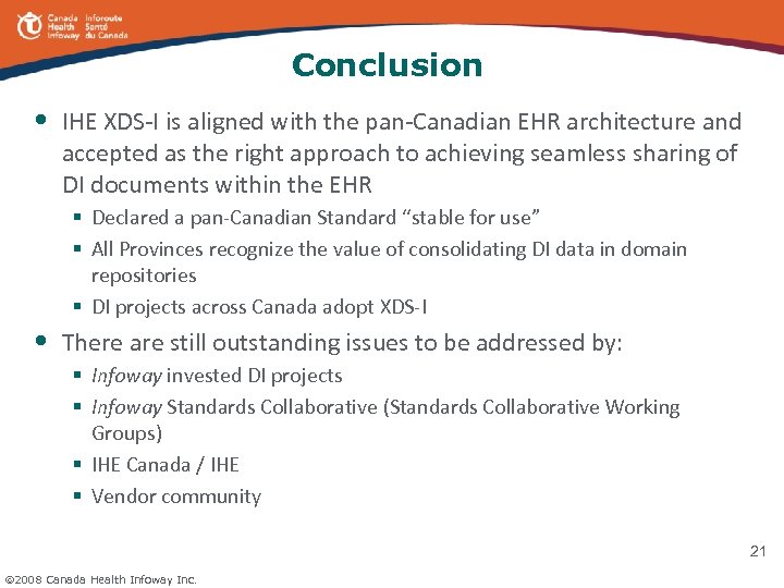Conclusion • • IHE XDS-I is aligned with the pan-Canadian EHR architecture and accepted as the right approach to achieving seamless sharing of DI documents within the EHR § Declared a pan-Canadian Standard “stable for use” § All Provinces recognize the value of consolidating DI data in domain repositories § DI projects across Canada adopt XDS-I There are still outstanding issues to be addressed by: § Infoway invested DI projects § Infoway Standards Collaborative (Standards Collaborative Working Groups) § IHE Canada / IHE § Vendor community 21 2008 Canada Health Infoway Inc.