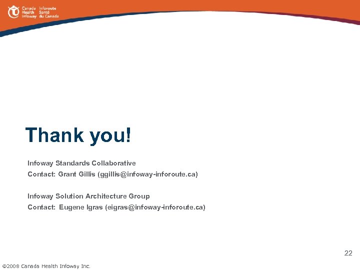 Thank you! Infoway Standards Collaborative Contact: Grant Gillis (ggillis@infoway-inforoute. ca) Infoway Solution Architecture Group Contact: Eugene Igras (eigras@infoway-inforoute. ca) 22 2008 Canada Health Infoway Inc.