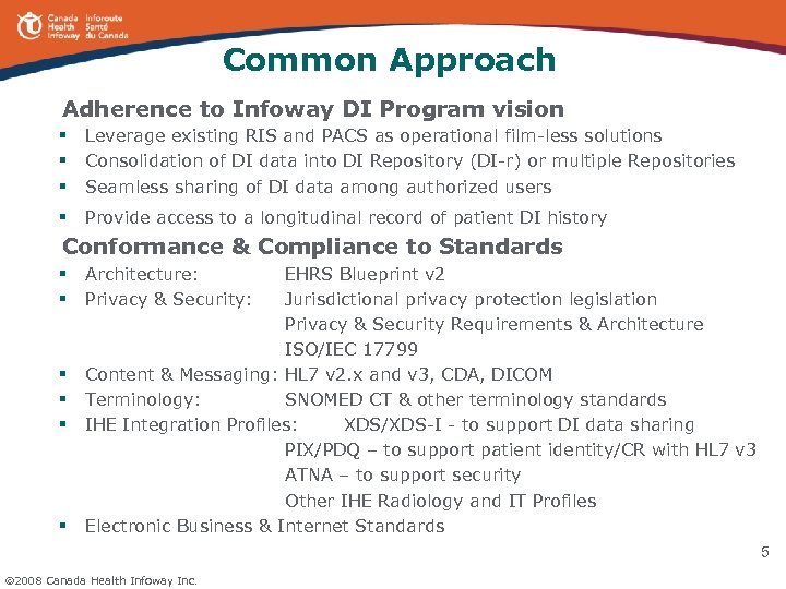 Value Proposition • Improve Access to Services § Provide timely access to DI information irrespective of where the images were acquired and/or the report transcribed § Provide access to a longitudinal record of patient DI history § Improve timeliness and continuity of care § Enable real-time collaboration and clinical consultations § Improve training opportunities • Improve Productivity & Contain Costs § Increase patient throughput, reduce patient transfers and wait times § Provide capabilities for Radiologists to share workload across the region § Reduce DI exams by reducing avoidable retakes • Improve Quality of Care § Improve quality of DI information (accuracy, completeness, consistency) § Reduce radiation exposure § Reduce medical errors 2008 Canada Health Infoway Inc. 4
