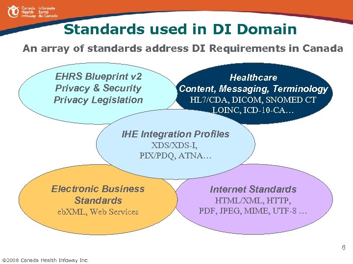 Common Approach Adherence to Infoway DI Program vision § Leverage existing RIS and PACS as operational film-less solutions § Consolidation of DI data into DI Repository (DI-r) or multiple Repositories § Seamless sharing of DI data among authorized users § Provide access to a longitudinal record of patient DI history Conformance & Compliance to Standards § Architecture: § Privacy & Security: § § EHRS Blueprint v 2 Jurisdictional privacy protection legislation Privacy & Security Requirements & Architecture ISO/IEC 17799 Content & Messaging: HL 7 v 2. x and v 3, CDA, DICOM Terminology: SNOMED CT & other terminology standards IHE Integration Profiles: XDS/XDS-I - to support DI data sharing PIX/PDQ – to support patient identity/CR with HL 7 v 3 ATNA – to support security Other IHE Radiology and IT Profiles Electronic Business & Internet Standards 5 2008 Canada Health Infoway Inc.