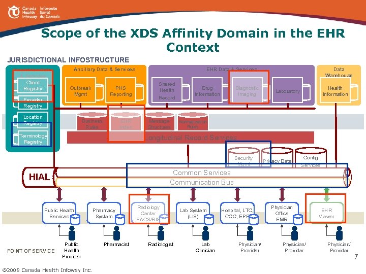 Standards used in DI Domain An array of standards address DI Requirements in Canada EHRS Blueprint v 2 Privacy & Security Privacy Legislation Healthcare Content, Messaging, Terminology HL 7/CDA, DICOM, SNOMED CT LOINC, ICD-10 -CA… IHE Integration Profiles XDS/XDS-I, PIX/PDQ, ATNA… Electronic Business Standards eb. XML, Web Services Internet Standards HTML/XML, HTTP, PDF, JPEG, MIME, UTF-8 … 6 2008 Canada Health Infoway Inc.