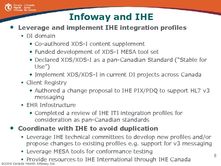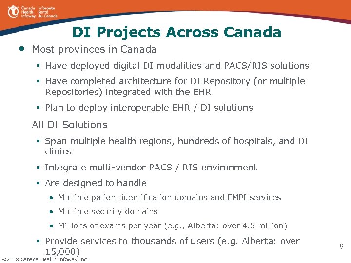 Infoway and IHE • Leverage and implement IHE integration profiles § DI • • • domain Co-authored XDS-I content supplement Funded development of XDS-I MESA tool set Declared XDS/XDS-I as a pan-Canadian Standard (“Stable for Use”) • Implement XDS/XDS-I in current DI projects across Canada § Client Registry • Authored a change proposal to IHE PIX/PDQ to support HL 7 v 3 messaging § EHR Infostructure • Completed a review of IHE ITI integration profiles for consideration as pan-Canadian standards • Coordinate with IHE to avoid duplication § Leverage IHE technical committees to develop new profiles and/or propose changes to existing profiles e. g. support for v 3 messaging § Leverage MESA tools for conformance testing § Provide resources to IHE International through IHE Canada 2008 Canada Health Infoway Inc. 8
