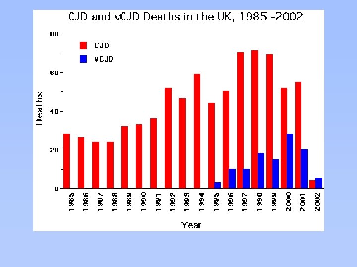 141 Cases of Probable or Confirmed Variant CJD (v. CJD) in Six Countries [through Jan 2003] UK - 131 (total definite+probable; 119 dead) France - 6 Ireland – 1* Italy - 1 US – 1* Canada – 1* [Spain – 1* possible, under investigation] ----------------* Long-time UK residents