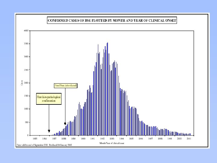 22 Countries with BSE in Native Cattle [yr first reported & approx. total cases reported to OIE thro’ Jan 2003] l UK 1986 (>182 581) [1443 in 2000; 1202 in ‘ 01; 755 in ‘ 02] l l l Ireland 1989 (1150) Switzerland 1990 (420) France 1991 (692) Portugal 1994 (699) Belgium 1997 (98) Netherlands 1997 (52) Luxembourg 1997 (2) Liechtenstein 1998 (2) Denmark 2000 (10) Germany 2000 (235) l l l l l Spain 2000 (210) Italy 2000 (56) Greece 2001 (1) Czech Repub 2001 (2) Slovakia 2001 (10) Japan 2001 (7 or ? 8) Slovenia 2001 (2) Finland 2001 (1) Austria 2001 (1) Poland 2002 (4) Israel 2002 (1)