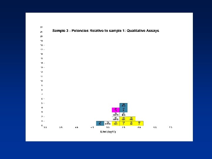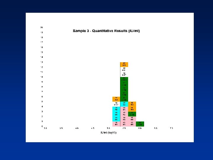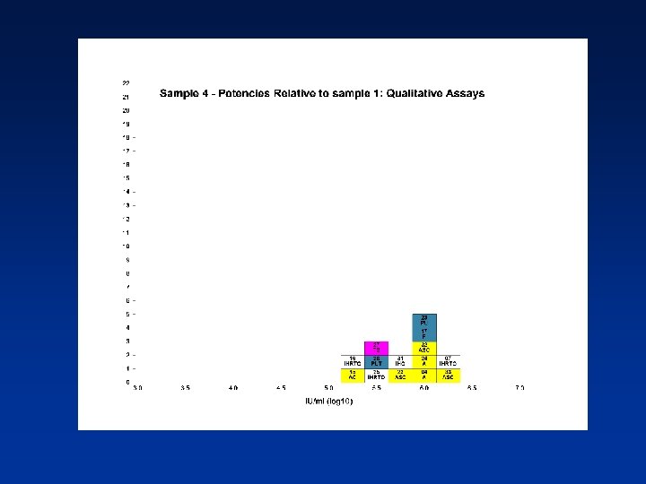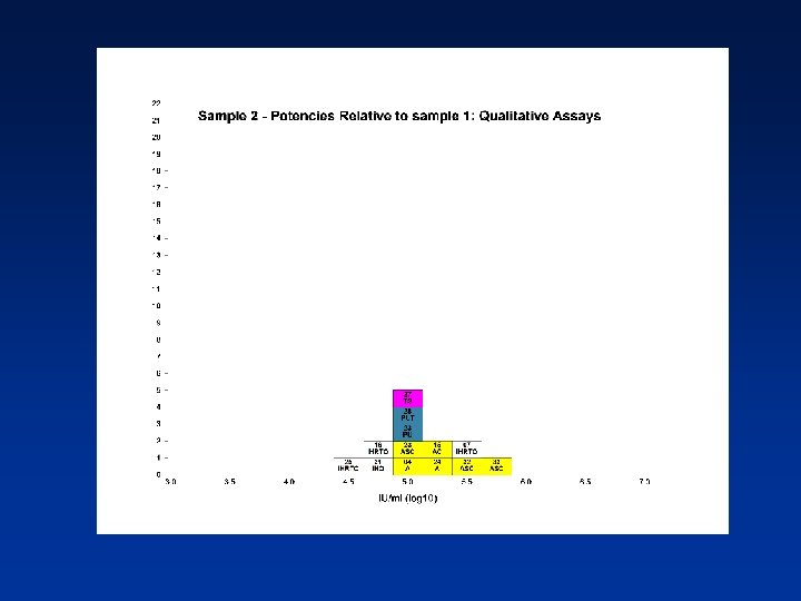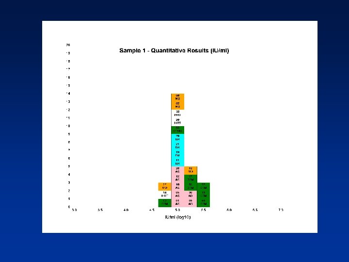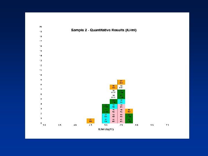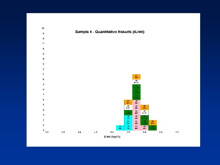Estimated IU/ml (log 10) from Quantitative Assays Sample N Mean 95% CI SD %CV 1 25 5. 10 5. 02 -5. 17 0. 19 3. 73 2 25 5. 32 5. 22 -5. 42 0. 24 4. 51 3 25 5. 51 5. 44 -5. 58 0. 17 3. 10 4 25 5. 74 5. 65 -5. 83 0. 22 3. 84 N - Number of laboratory estimates SD - Standard Deviation of log 10 estimates across laboratories
