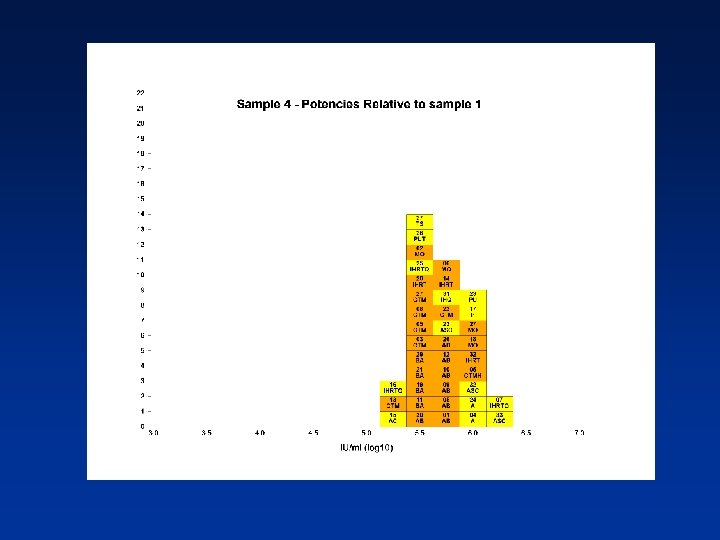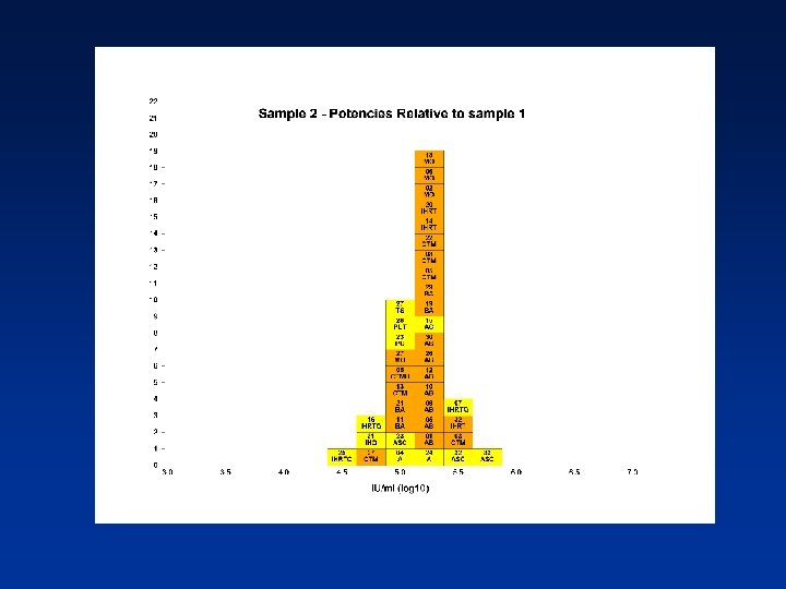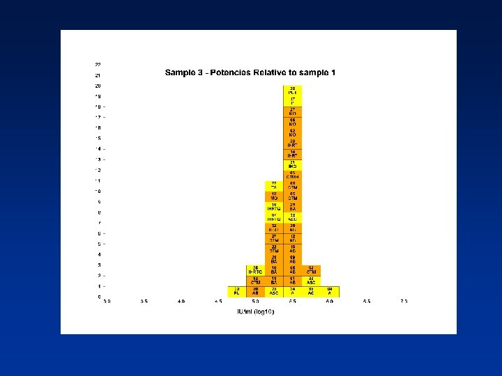 Overall Mean Potencies (log 10 IU/ml) Relative to Sample 1 Sample N Mean 95% CI SD %CV 2 38 5. 19 5. 11 -5. 27 0. 24 4. 62 3 39 5. 41 5. 34 -5. 48 0. 21 3. 82 4 39 5. 70 5. 62 -5. 78 0. 25 4. 31 N - Number of laboratory estimates SD - Standard Deviation of log 10 estimates across laboratories