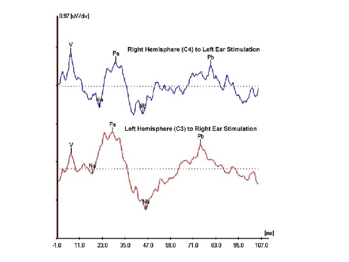 Hemispheric Asymmetry • When the amplitude of MLR is 50% or more on one hemisphere to contralateral stimulation compared to the other hemisphere with contralateral stimulation, this is construed as a positive finding. Lesion? Possibly… (after Musiek et al. , 1999) • An ear effect may be more likely than electrode effect in APD (Schochat et al. , 2004)
