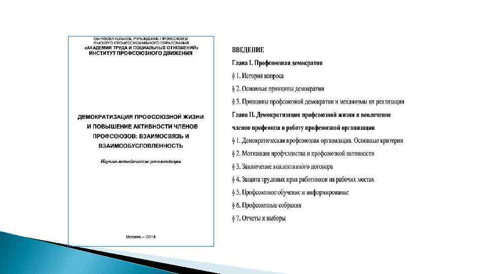 Принципы профсоюзной демократии Солидарность и единство действий. Добровольность вступления в профсоюз и свободный выход из него. Равенство прав всех членов профсоюза. Выборность всех профсоюзных органов и их подотчетность членам профсоюза. Коллегиальность в принятии решений и личная ответственность за выполнение принятых постановлений. Гласность в работе профсоюзных организаций и профсоюзных органов. Соблюдение внутрипрофсоюзной дисциплины и подчинение меньшинства большинству. Свобода мнений и дискуссий, уважение интересов каждого члена профсоюза, право меньшинства на защиту и разъяснение своей позиции на стадии обсуждения вопросов и единство действий после принятия решений. Обязательность выполнения решений вышестоящих профсоюзных органов, принятых в рамках устава, для нижестоящих профсоюзных организаций, их органов и членов Профсоюза. Периодическая отчетность профсоюзных органов перед своими организациями и вышестоящими профсоюзными органами.