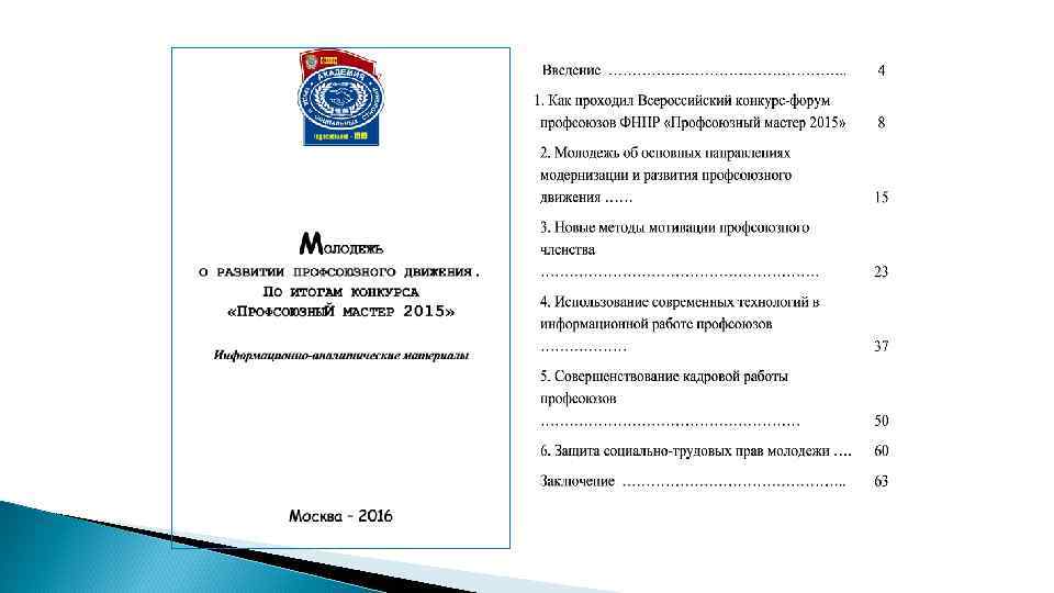 Проект «Кадровый резерв ФНПР» 2015 -2016 106 чл. орг. Утвердили резерв: 80 чел. - Прошли психологическое тестирование 37 чел. 24 чел. - Прошли обучение по программам профессиональной переподготовки - Избраны руководителями членских организаций ФНПР