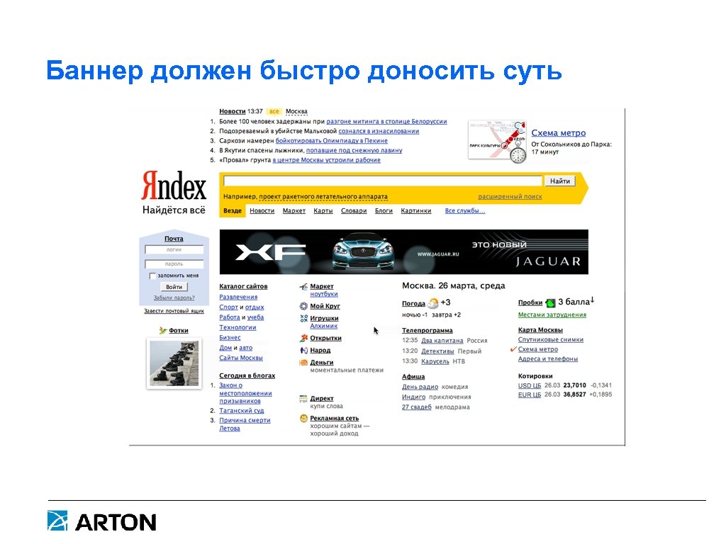Какой рекламный носитель важнее? A внимание баннер I интерес баннер D желание сайт A действие сайт Продает не баннер - продает сайт. Привлекает внимание и вызывает интерес не анимация на баннере, а предложение. У баннера ограниченная и простая задача - максимально быстро и понятно донести суть предложения.