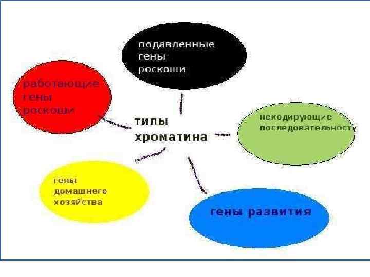 Виды хроматина на примере дрозофилы. YELLOW хроматин включает в себя активные гены домашнего хозяйства. RED хроматин содержит также активные, но тканеспецифичные гены. BLUE хроматин несет гены, участвующие в эмбриональном развитии BLACK хроматин содержит тканеспецефичные, но подавленные гены GREEN хроматин объединяет в основном некодирующие последовательности и множественные повторы.