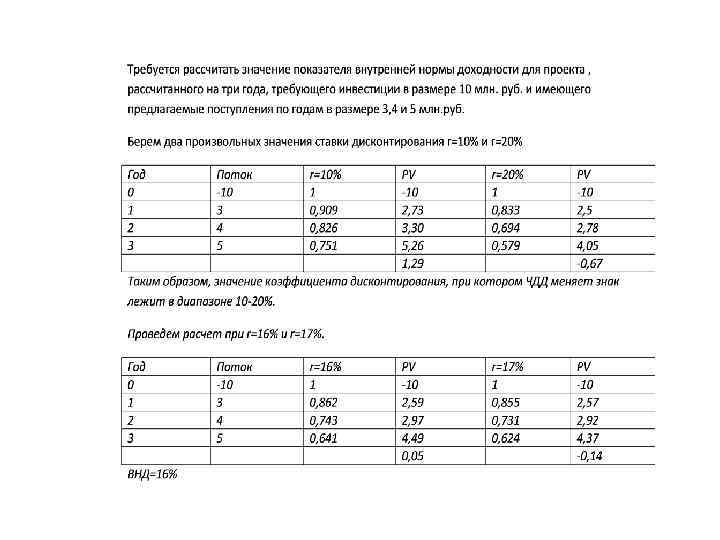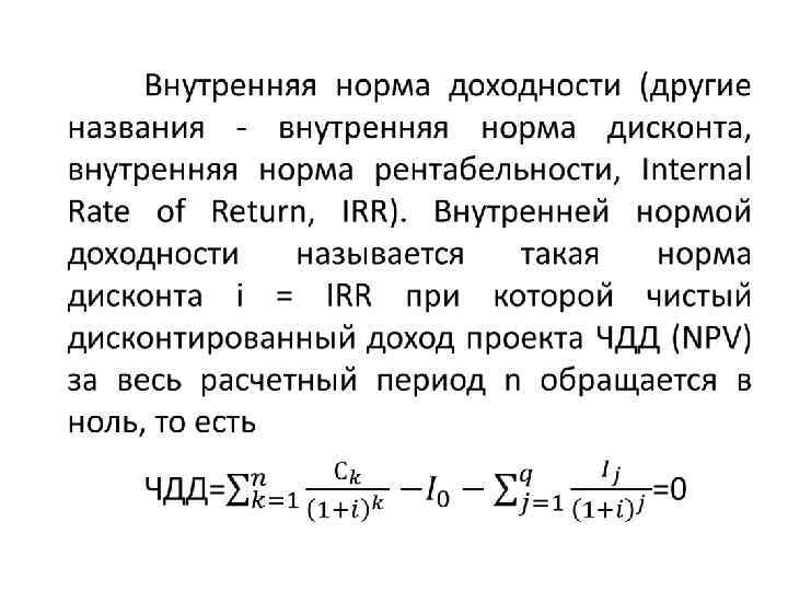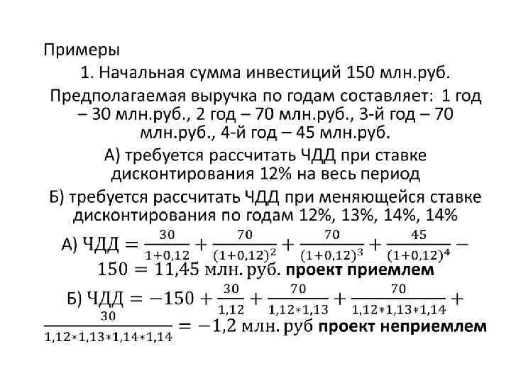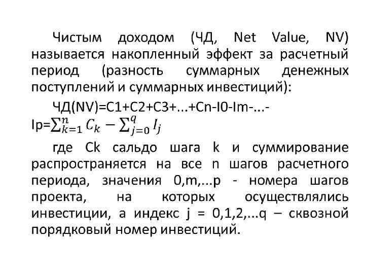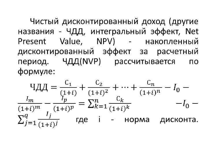 Чистыи доход ЧД (NV) и чистыи дисконтированныи доход ЧДД (NVP) являются показателями, характеризующими превышение суммарных денежных поступлении над суммарными инвестициями для данного проекта соответственно без учета и с учетом неравноценности денежных средств в различные моменты времени. Иными словами дается ответ на вопрос «Проект приносит доходы или убытки? » . Разность между значением ЧД (NV) и значением ЧДД (NVP) нередко называют дисконтом проекта.