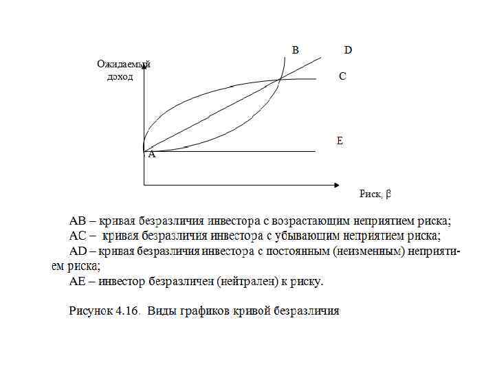 2) методика построения безрискового эквивалентного денежного потока, в основу которой положены идеи, развитые в рамках теории полезности и теории игр. Рассматривая поэлементно денежный поток рискового проекта, инвестор в отношении его пытается оценить, какая гарантированная, т. е. безрисковая, сумма потребуется ему, чтобы быть индифферентным к выбору между этой суммой и ожидаемой, т. е. рисковой, величиной k-го элемента потока. Графически отношение к риску выражается с помощью кривых безразличия (индифферентности)