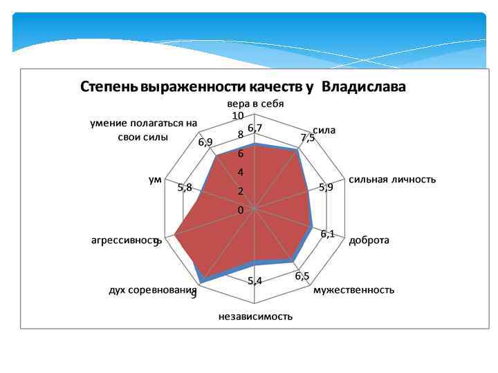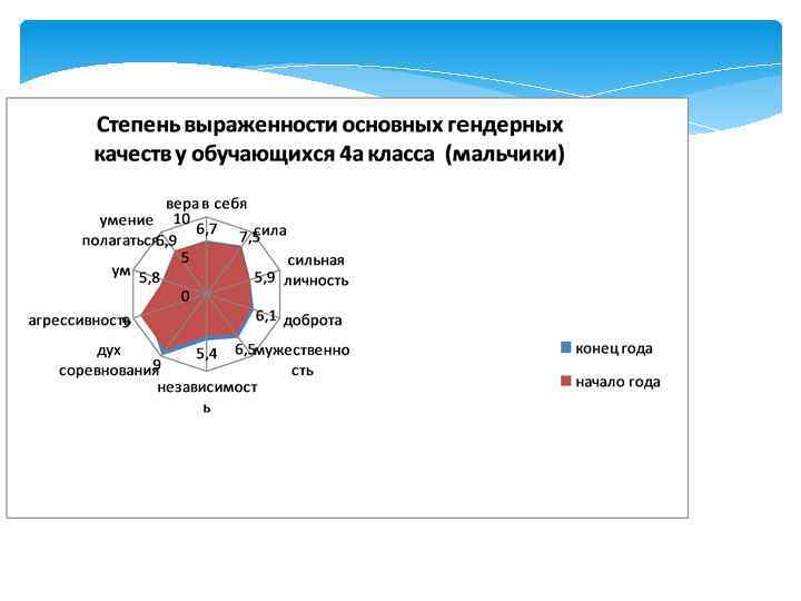 Степень выраженности гендерных качеств у обучающихся мальчики Имена мальчиков Качества личности Влад Сергей Саша Д Костя Саша К Дима Ваня Максим Всего 1. . вера в себя 6, 7 5, 1 4, 2 4, 1 3 5, 2 6, 8 5, 8 40, 9 2. сила 7, 5 5, 8 3, 9 2, 7 3, 9 6, 2 43, 0 3. сильная личность 5, 9 4, 8 3, 4 3, 9 3, 3 6 6, 3 6, 2 40, 4 4. доброта 6, 1 6, 2 5, 3 5, 1 6, 7 6, 6 44, 0 5. мужественность 6, 5 5, 3 4, 1 3, 9 3, 5 6, 4 7 6, 5 43, 2 6. независимость 5, 4 4, 7 3, 2 3, 7 4, 1 5 5, 5 4, 5 36, 1 7. дух соревнования 6, 9 5, 2 3, 8 3, 2 4, 5 6, 9 6, 6 6, 1 43, 2 8. агрессивность 3, 5 3, 1 3, 5 3 5, 7 5, 6 3, 8 4, 8 33, 0 9. ум 5, 1 4, 9 3, 3 3, 9 1, 6 6, 5 5, 6 6, 2 37, 0 10. полагаться на свои силы 6, 9 4, 6 3, 8 4, 8 3, 2 6, 7 5, 7 6, 5 42, 5 Всего 60, 5 49, 7 38, 5 38, 2 35, 8 60, 3 60, 2 59, 4 402, 3 Среднее значение, полученное от деления суммы всех баллов на 10 6, 05 4, 97 3, 85 3, 82 3, 58 6, 03 6, 02 5, 94 40, 23 Рейтинг обучающегося 1 5 6 7 8 2 3 4 Среднее значение выраженности качеств в группе 4, 47