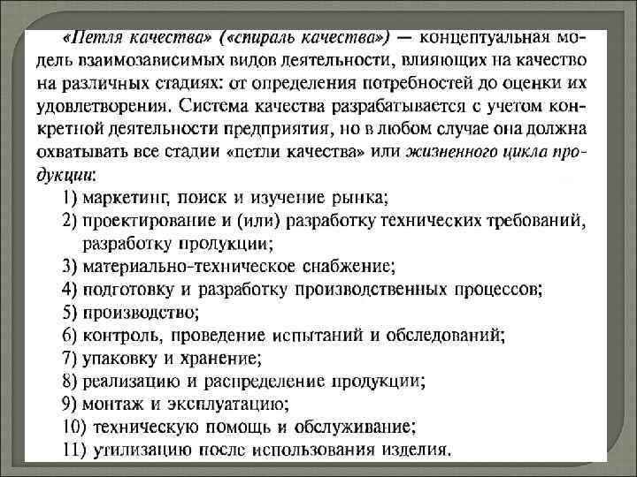Обеспечение качества продукции - это совокупность планируемых и систематически проводимых мероприятий, создающих необходимые условия для выполнения каждого этапа "петли качества", чтобы продукция удовлетворяла требованиям к качеству.