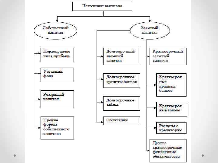 Долгосрочный заемный капитал: q Долгосрочные кредиты банков; q - долгосрочные кредиты и займы небанковских учреждений; q Прочие долгосрочные обязательства. Краткосрочный заемный капитал: q Краткосрочные кредиты банков; q Краткосрочные кредиты и займы небанковских учреждений; q Кредиторская задолженность за товары, работы и услуги; q Текущие обязательства по расчетам; q Прочие.
