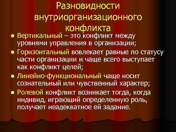 Разновидности внутриорганизационного конфликта l Вертикальный – это конфликт между уровнями управления в организации; l Горизонтальный вовлекает равные по статусу части организации и чаще всего выступает как конфликт целей; l Линейно-функциональный чаще носит сознательный или чувственный характер; l Ролевой конфликт возникает тогда, когда индивид, играющий определенную роль, получает неадекватное ей задание.