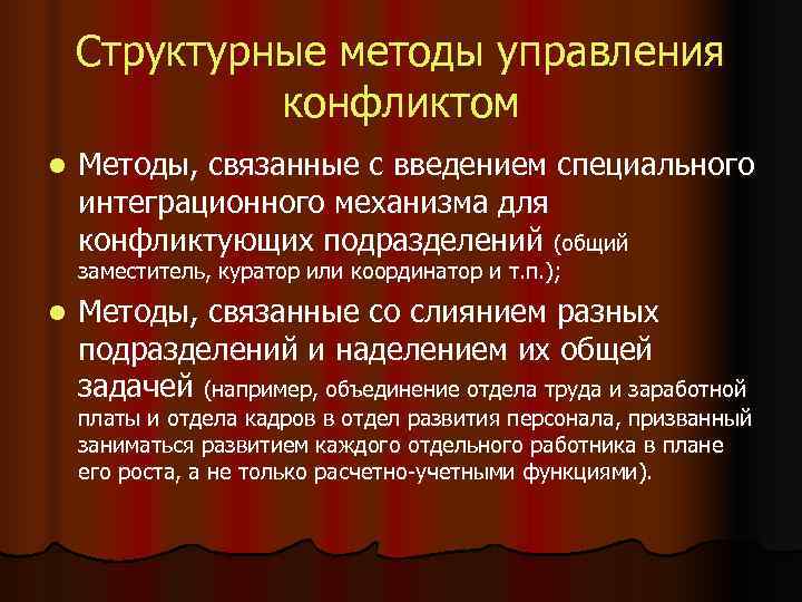 Структурные методы управления конфликтом l Методы, связанные с введением специального интеграционного механизма для конфликтующих подразделений (общий заместитель, куратор или координатор и т. п. ); l Методы, связанные со слиянием разных подразделений и наделением их общей задачей (например, объединение отдела труда и заработной платы и отдела кадров в отдел развития персонала, призванный заниматься развитием каждого отдельного работника в плане его роста, а не только расчетно-учетными функциями).