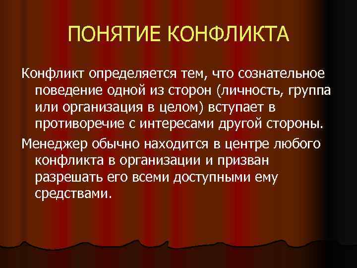 ПОНЯТИЕ КОНФЛИКТА Конфликт определяется тем, что сознательное поведение одной из сторон (личность, группа или организация в целом) вступает в противоречие с интересами другой стороны. Менеджер обычно находится в центре любого конфликта в организации и призван разрешать его всеми доступными ему средствами.
