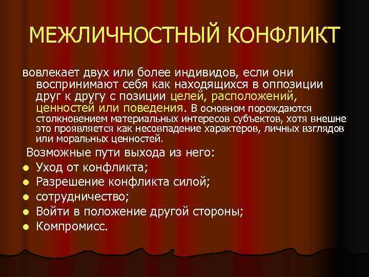 МЕЖЛИЧНОСТНЫЙ КОНФЛИКТ вовлекает двух или более индивидов, если они воспринимают себя как находящихся в оппозиции друг к другу с позиции целей, расположений, ценностей или поведения. В основном порождаются столкновением материальных интересов субъектов, хотя внешне это проявляется как несовпадение характеров, личных взглядов или моральных ценностей. Возможные пути выхода из него: l Уход от конфликта; l Разрешение конфликта силой; l сотрудничество; l Войти в положение другой стороны; l Компромисс.