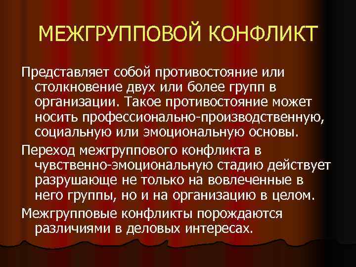 МЕЖГРУППОВОЙ КОНФЛИКТ Представляет собой противостояние или столкновение двух или более групп в организации. Такое противостояние может носить профессионально-производственную, социальную или эмоциональную основы. Переход межгруппового конфликта в чувственно-эмоциональную стадию действует разрушающе не только на вовлеченные в него группы, но и на организацию в целом. Межгрупповые конфликты порождаются различиями в деловых интересах.