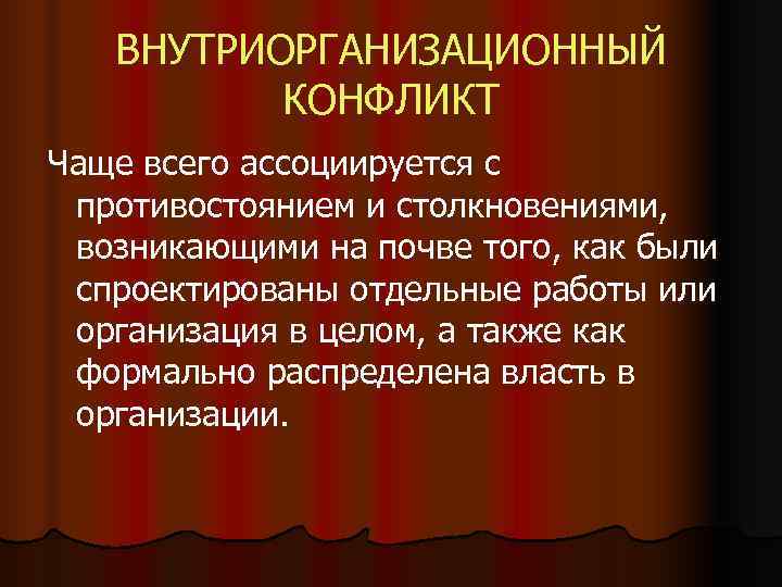 ВНУТРИОРГАНИЗАЦИОННЫЙ КОНФЛИКТ Чаще всего ассоциируется с противостоянием и столкновениями, возникающими на почве того, как были спроектированы отдельные работы или организация в целом, а также как формально распределена власть в организации.