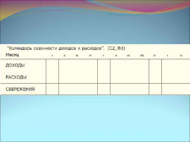 “Успешные практики/примеры управления сезонностью” (С 2_Ф 4) • Записывайте и анализируйте расходы. • Заранее планируйте средства на сезонные расходы (топливо на обогрев, школьные учебники). • Правило: ”Если не тратить в понедельник, в пятницу останется больше денег”. • Совершайте покупки в тот сезон, когда цены на них наиболее низкие (например, покупка топлива для обогрева дома в мае, фруктов и овощей – летом, для замораживания и консервирования). • Совершайте покупки по сниженным ценам. • Планируйте еду на неделю. • Готовьте еду сами (консервирование, заморозка продуктов, завтраки). • Помогайте соседям и воспользуйтесь их помощью сами. • Используйте возможности получения дополнительных доходов (сбор макулатуры и металлолома, сезонные работы).