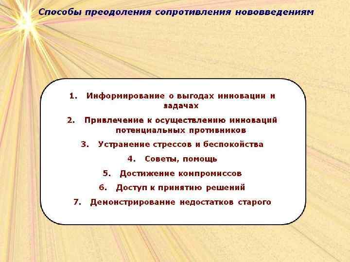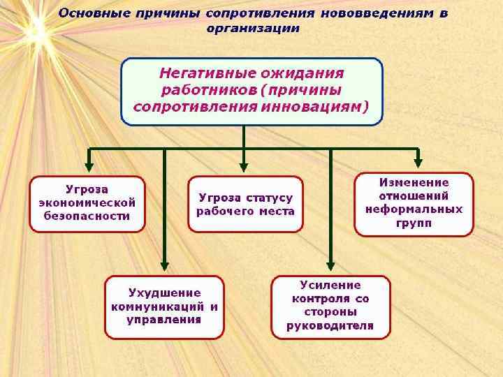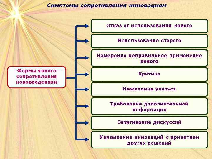 Сопротивление нововведениямлюбое поведение члена организации, направленное на срыв и дискредитацию осуществляемых преобразований