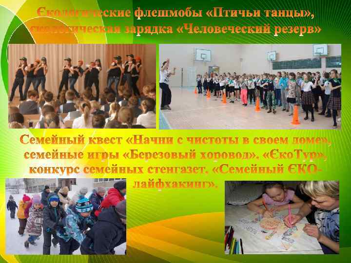 Мероприятия практической и природоохранной направленности: акции «Помоги Другу» , «Разделяй с нами» , «Покормите птиц зимой» , «Поможем пернатым друзьям» , субботники, экологические десанты, посадка деревьев, выращивание рассады цветов и др.