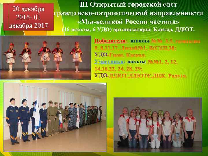 20 декабря 2016 - 01 декабря 2017 III Открытый городской слет гражданско-патриотической направленности «Мы-великой России частица» (18 школы, 6 УДО) организаторы: Каскад, ДДЮТ. Победители школы УДО Участники: школы УДО