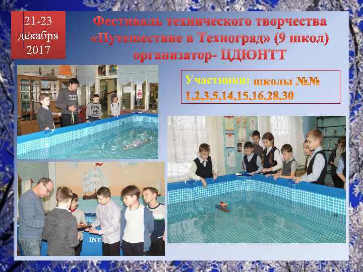 21 -23 декабря 2017 Фестиваль технического творчества «Путешествие в Техноград» (9 школ) организатор- ЦДЮНТТ Участники: