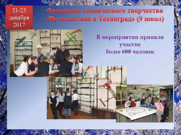 21 -23 декабря 2017 Фестиваль технического творчества «Путешествие в Техноград» (9 школ) В мероприятии приняли участие более 600 человек
