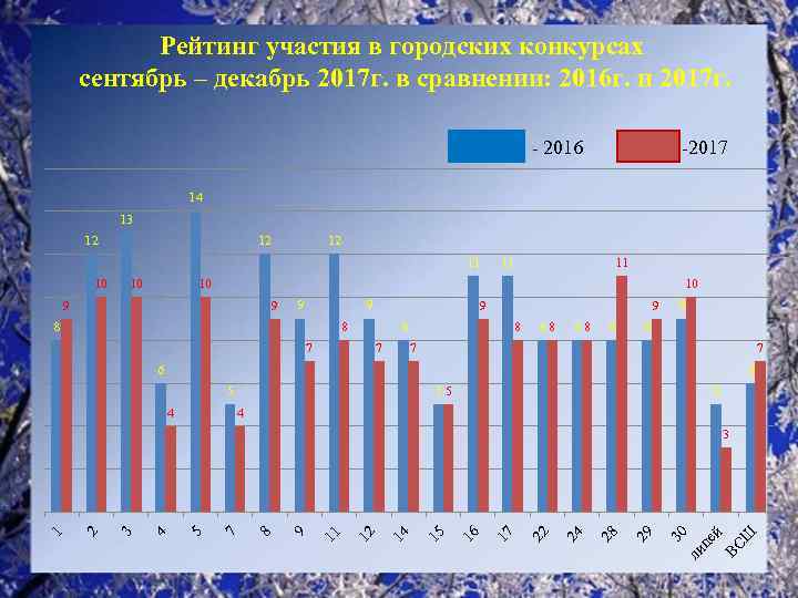 Рейтинг участия в городских конкурсах сентябрь – декабрь 2017 г. в сравнении: 2016 г. и 2017 г. - 2016 -2017 14 13 12 12 12 11 10 10 11 11 10 10 9 9 8 8 7 7 8 88 88 8 9 8 7 7 6 6 5 4 55 5 4 Ш ВС й це ли 30 29 28 24 22 17 16 15 14 12 11 9 8 7 5 4 3 2 1 3