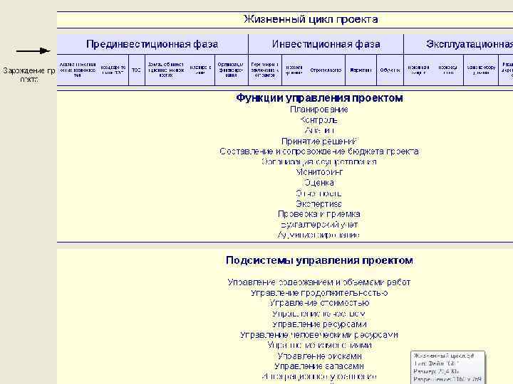 Окончанием существования проекта может быть: • ввод в действие объектов, начало их эксплуатации и использования результатов выполнения проекта; • перевод персонала, выполнявшего проект, на другую работу; • достижение проектом заданных результатов; • прекращение финансирования проекта; • начало работ по внесению в проект серьезных изменений, не предусмотренных первоначальным замыслом (модернизация); • вывод объектов проекта из эксплуатации.