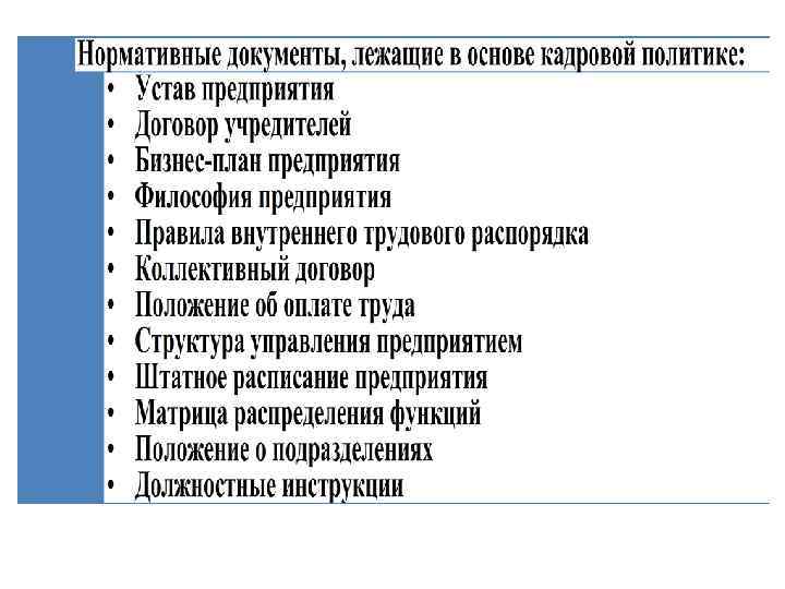 Кадровая политика главное направление в работе с кадрами набор основополагающих принципов целенаправленная деятельность по созданию трудового коллектива, который наилучшим образом способствовал бы совмещению целей и приоритетов предприятия и его работников.