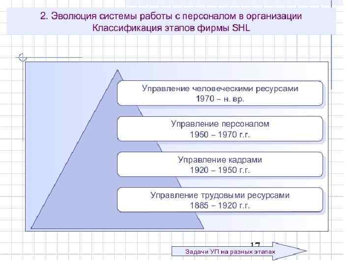Исходя из потребностей практического менеджмента 80 -х – 90 -х гг. ХХ в. происходит эволюция подходов к управлению персоналом в концепциях теоретиков: ОК ОУП ОУЧР ОСУЧР Кадровая работа: (персонализдержки) (персоналресурс) -Оформление приема и увольнения сотрудников; Комплексный подход к функциям управления персоналом: наем, оценка, вознаграждение, развитие и мотивация персонала Системный подход к управлению персоналом – самым важным ресурсом фирмы Стратегический подход к управлению персоналом в условиях эффективной организационной культуры -Ведение необходимой статистики о составе персонала