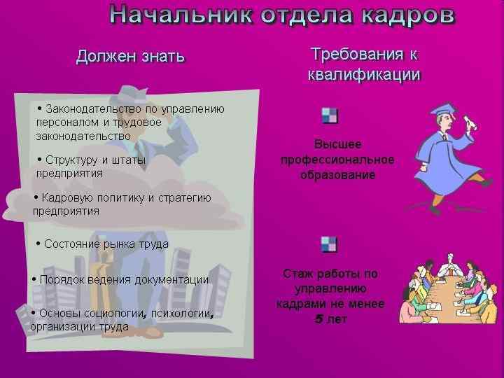 Характер выполняемых функций и решаемых задач предопределяет требования к кадровой службе: v необходимость проведения научноисследовательских разработок (например, опросов для выявления факторов, причин, последствий применительно к трудовым отношениям) v установление контактов с территориальными органами управления трудом и субъектами рынка труда, в связи с необходимостью изучения ситуации на рынке труда v подбора кадров, их обучения и повышения квалификации и т. д.