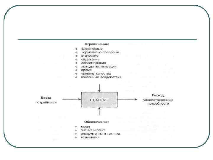 КОНЦЕПЦИЯ УПРАВЛЕНИЯ ПРОЕКТАМИ Существует ряд определений термина «проект» , каждое из которых имеет право на существование, в зависимости от конкретной задачи, стоящей перед специалистом. l В самом общем виде проект (англ. project) — это «что -либо, что задумывается или планируется» (толковый словарь Webster). l С точки зрения системного подхода, проект может рассматриваться как процесс перехода из исходного состояния в конечное — результат при участии ряда ограничений и механизмов: