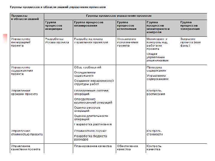Области знаний проекта n Управление интеграцией проекта n Управление содержанием проекта (процессы, обеспечивающие включение в проект тех и только (процессы, необходимые для определения, уточнения, комбинирования, объединения и координации различных процессов и действий по управлению проектом в рамках групп процессов управления проектами) тех работ, которые необходимы для успешного завершения проекта) n n Управление сроками проекта (процессы, обеспечивающие своевременное завершение проекта) Управление стоимостью проекта (процессы, выполняемые в ходе планирования, разработки бюджета и управления расходами и обеспечивающие завершение проекта в рамках утвержденного бюджета) n Управление качеством проекта (включает в себя процессы и действия исполняющей организации, политику в области качества, цели и сферы ответственности в области качества таким образом, чтобы проект удовлетворял тем нуждам, ради которых он был предпринят)