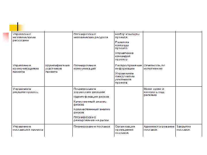 n Управление человеческими ресурсами (включает в себя процессы организации, управления и руководства командой проекта. Команда проекта состоит из людей, которым определены роли и ответственность за выполнение проекта) n Управление коммуникациями проекта (включает в себя процессы, необходимые для своевременного создания, сбора, распространения, хранения, получения и, в конечном счете, использования информации проекта) n Управление рисками проекта (включает в себя процессы, относящиеся к планированию управления рисками, их идентификации и анализу, реагированию на риски, а также контролю и управлению рисками в рамках проекта) n Управление поставками проекта (включает в себя процессы покупки или приобретения тех необходимых продуктов, услуг или результатов, которые производятся вне исполняющей организации)